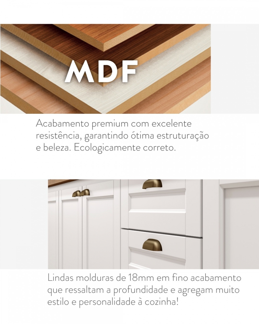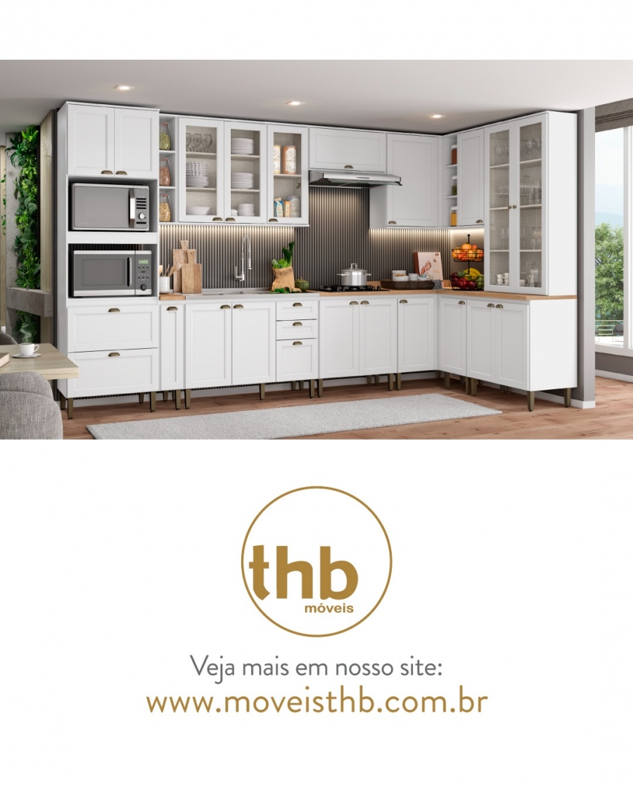 Cozinha THB Classy MDF 01/01/2025 Inspirada no estilo provençal, a Cozinha THB Classy é produzida em MDF de alta qualidade, permitindo que você monte ambientes funcionais sem perder a praticidade e elegância de uma cozinha planejada.