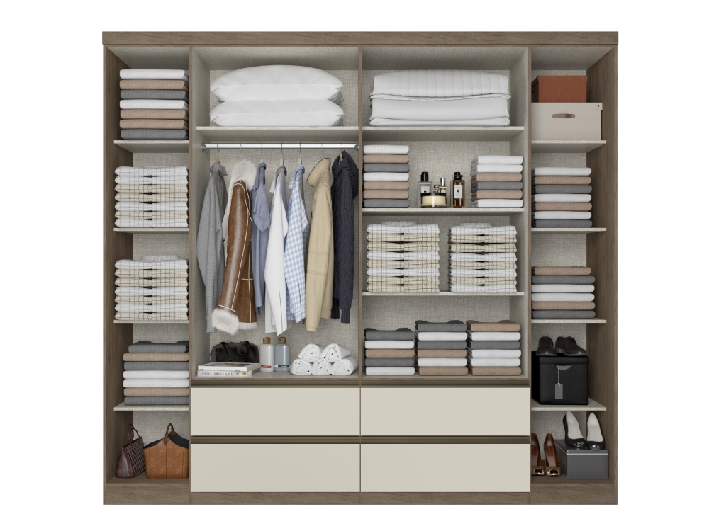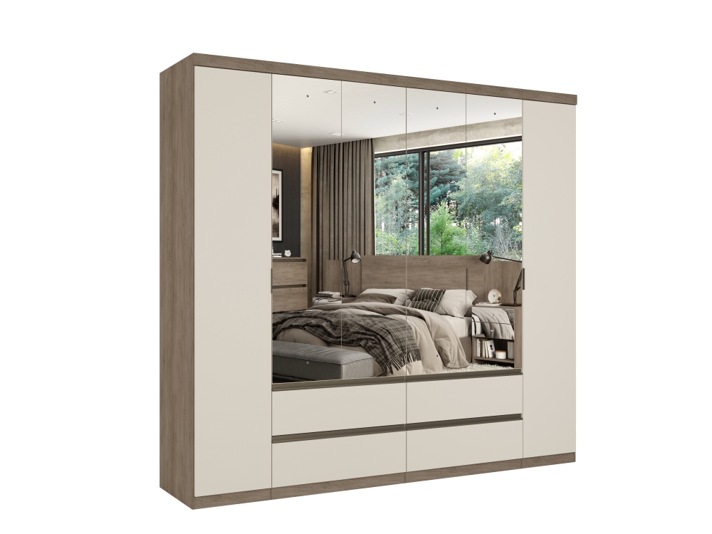 É constituído de 6 portas e 4 gavetas externas com trilho telescópico que conferem conforto e praticidade ao móvel. Seu amplo espaço interno possui cabideiros, maleiros grandes e muitas prateleiras, uma excelente divisão ele/ela.