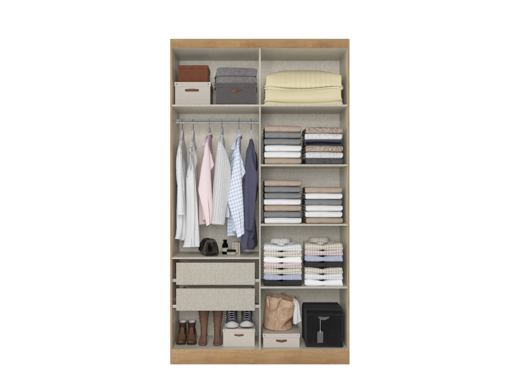 Seu interno possui ótima divisão com cabideiro, 2 gavetas internas e prateleiras. Ainda possui espaço para colocar sapatos e um amplo maleiro interligado, proporcionando espaço completo para acomodar os seus pertences de maneira organizada.