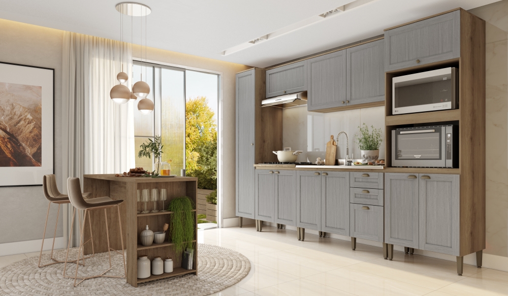 Compõem a cozinha portas e frentes de gavetas com molduras (opção de vidro incolor nos módulos aéreo 120cm e Cristaleira), corrediças telescópicas, puxadores concha e ponto na cor bronze, pés reguláveis, dobradiças 35mm com sistema de amortecimento, entre outros diferenciais que só a cozinha Royal oferece!