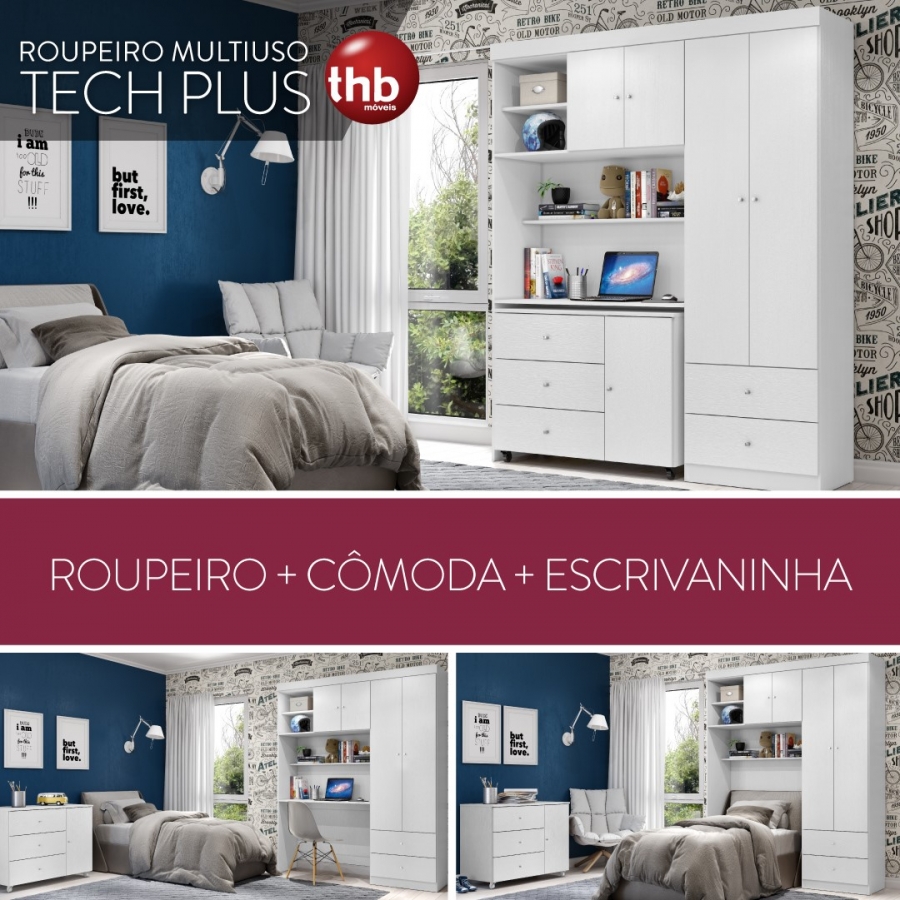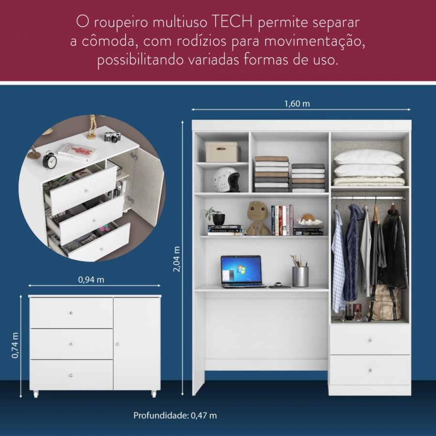 No roupeiro multiuso TECH você pode desencaixar facilmente a cômoda com rodízios, deixando o espaço para usar como escrivaninha ou como ‘‘mini-modulado’’: quando a cama é encaixada. É um móvel ideal para jovens, estudantes e até para casais que estão começando. Indicado especialmente para apartamentos e casas menores, cuja demanda no Brasil hoje é grande. Possui excelente aproveitamento interno com gavetas, prateleiras e cabideiro. Com um toque final do puxador ponto e o padrão de cor Branco Sensitive.