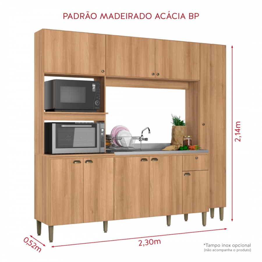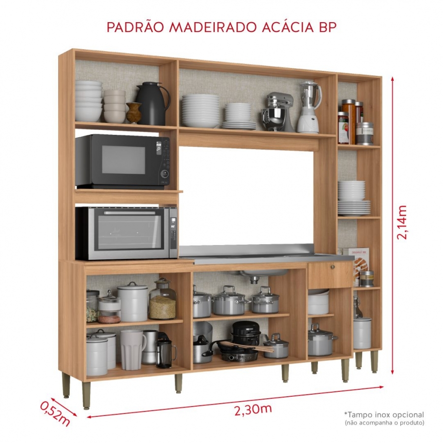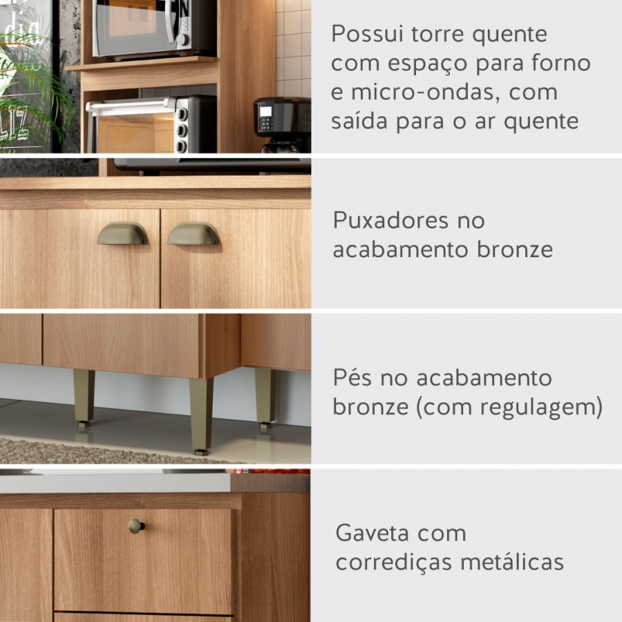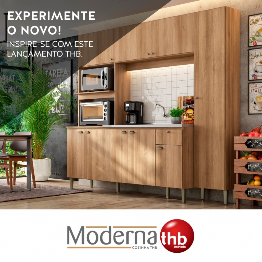 A THB buscou uma nova forma de se expressar para criar a cozinha MODERNA, de um conceito único, criativa e completa. Possui uma referência harmônica de cores e combinações, através do lindo padrão madeirado Acácia BP, combinado com puxadores e pés no acabamento bronze, que imprimem personalidade e possibilitam muitas combinações ao ambiente.