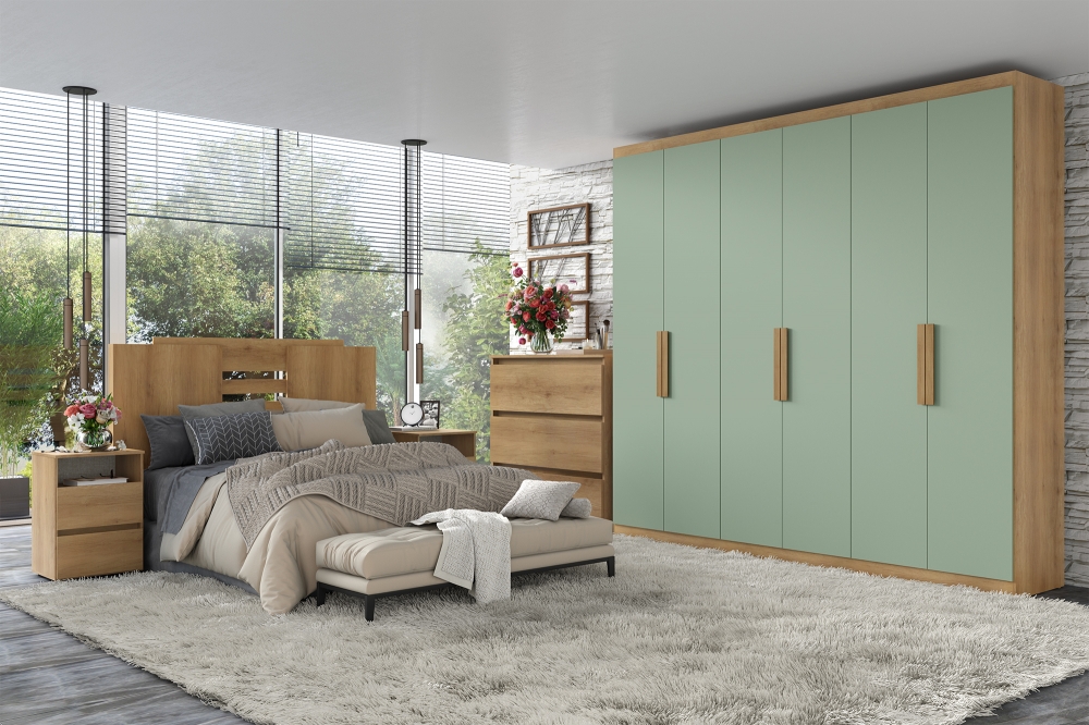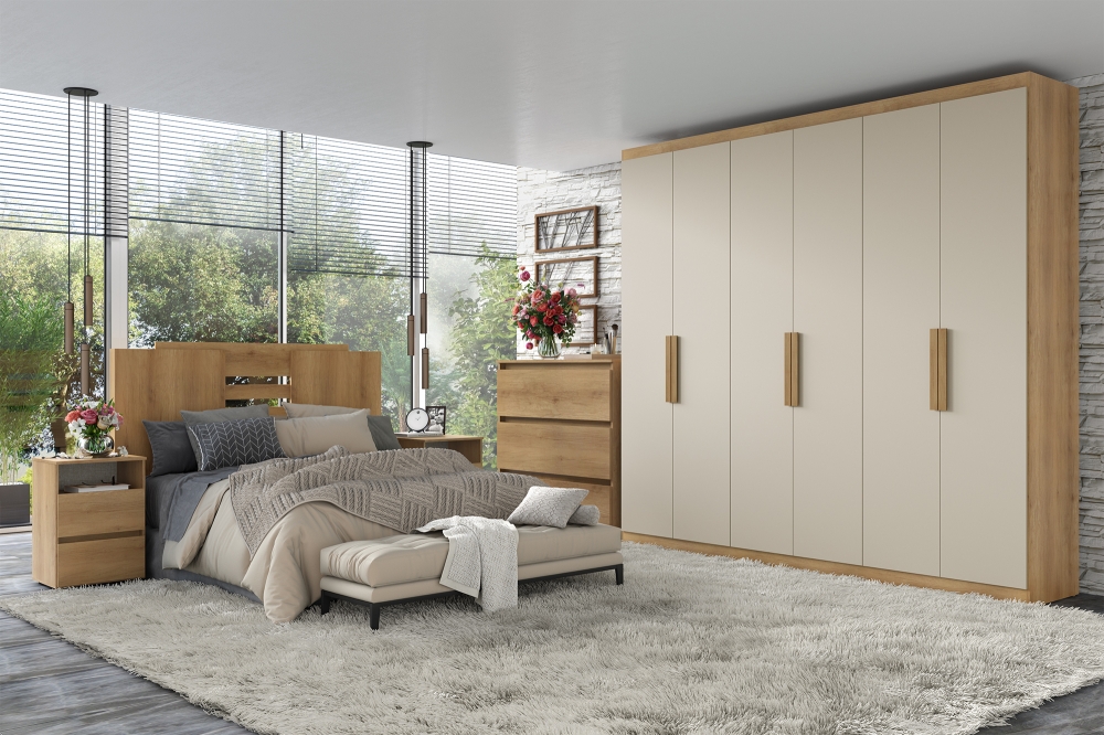 Com design contemporâneo, é composto por 6 portas, com puxadores em MDF no amadeirado CAPUCCINO.