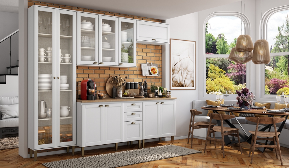 Inspirada no estilo provençal, a Cozinha Classy é produzida 100% em MDF de alta qualidade, permitindo que você monte ambientes funcionais sem perder a praticidade e elegância de uma cozinha planejada. A cozinha Classy possui portas e frentes de gavetas com molduras, opção de vidros nos módulos aéreo 120cm e Cristaleira, corrediças telescópicas, puxadores concha na cor bronze, pés reguláveis, dobradiças 35mm com sistema de amortecimento, aéreos com confortáveis 90cm de altura, torre e cristaleira com 2,40m de altura, entre outros diferenciais que só a cozinha Classy tem. O padrão branco acetinado com tampos amadeirados remetem a cozinha diretamente ao clássico estilo provençal, com conceito minimalista, oferecendo muita classe e sofisticação ao ambiente. O lançamento possui muitos diferenciais exclusivos da THB que vão encantar nessa cozinha feita especialmente para você!