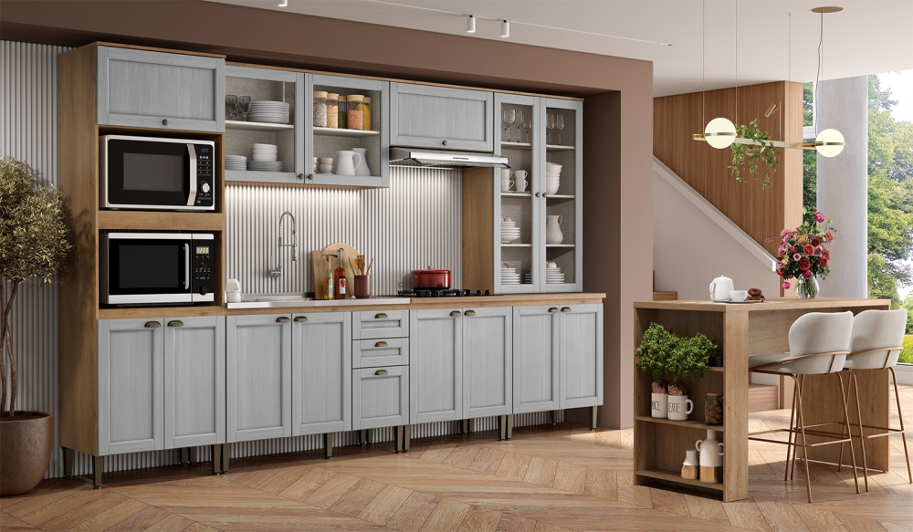 Compõem a cozinha portas e frentes de gavetas com molduras (opção de vidro incolor nos módulos aéreo 120cm e Cristaleira), corrediças telescópicas, puxadores concha e ponto na cor bronze, pés reguláveis, dobradiças 35mm com sistema de amortecimento, entre outros diferenciais que só a cozinha Royal oferece!