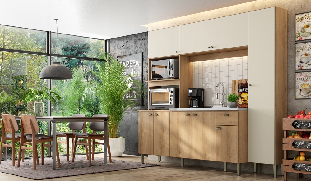 Possui uma referência harmônica de cores e combinações, através do lindo padrão madeirado Capuccino, combinado com portas superiores Off White, puxadores e pés no acabamento bronze que imprimem personalidade e possibilitam muitas combinações ao ambiente. Experimente o novo! Inspire-se com a nova cozinha Moderna!