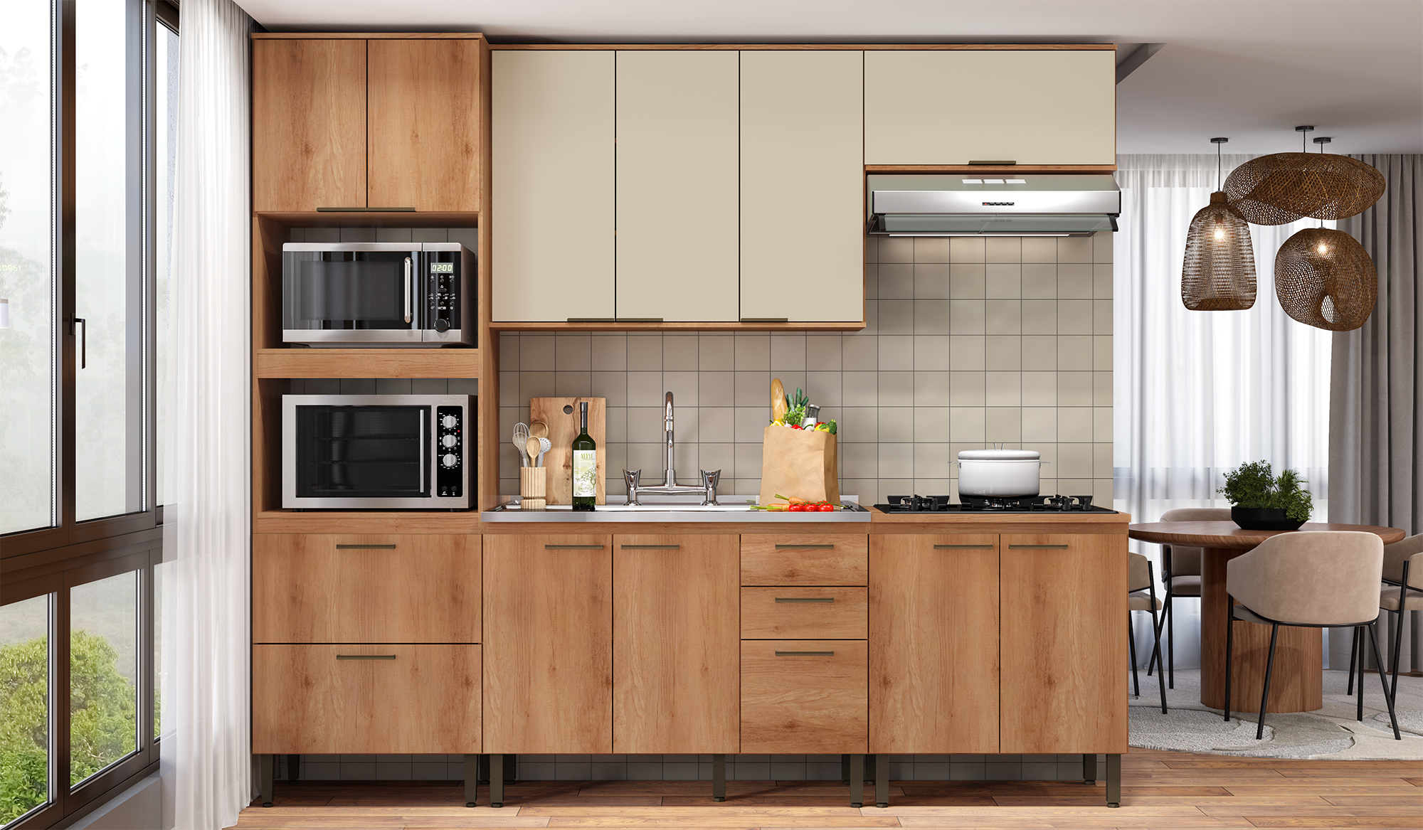 A cozinha PRINCESS da THB é 100% em MDF, desenvolvida para transformar o seu lar com elegância e sofisticação. No novo padrão de cor Freijó, ela traz o aconchego da madeira e a sofisticação que tornam o ambiente ainda mais convidativo. As portas dos aéreos são produzidas em duas opções de cores para você escolher: Sálvia - para um toque leve e contemporâneo, ou Areia, para uma proposta clean e elegante.O grande destaque está no acabamento SOFT das portas e frentes de gavetas, com toque macio e suave que transforma cada detalhe em uma experiência de conforto.Conta ainda com puxadores em alumínio na cor bronze, dobradiças com amortecimento e corrediças telescópicas, que garantem resistência, durabilidade e um visual moderno que valoriza o conjunto.PRINCESS é mais que uma cozinha — é o espaço onde os momentos mais especiais da casa ganham vida!COZINHA THB PRINCESS — feita para acolher histórias, sabores e sorrisos todos os dias!”