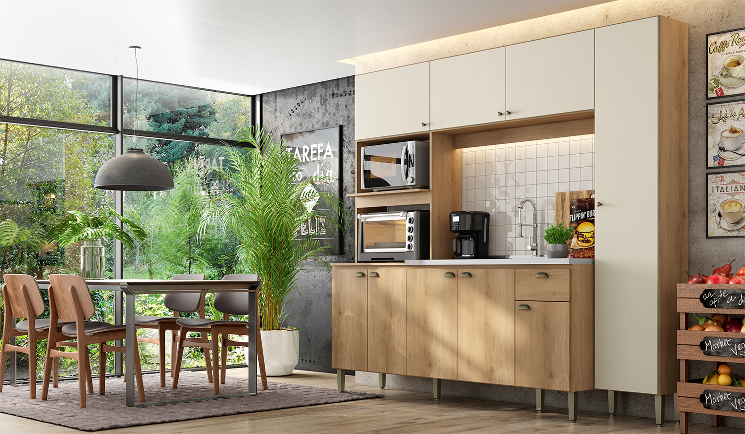 Possui uma referência harmônica de cores e combinações, através do lindo padrão madeirado Capuccino, combinado com portas superiores Off White, puxadores e pés no acabamento bronze que imprimem personalidade e possibilitam muitas combinações ao ambiente. Experimente o novo! Inspire-se com a nova cozinha Moderna!
