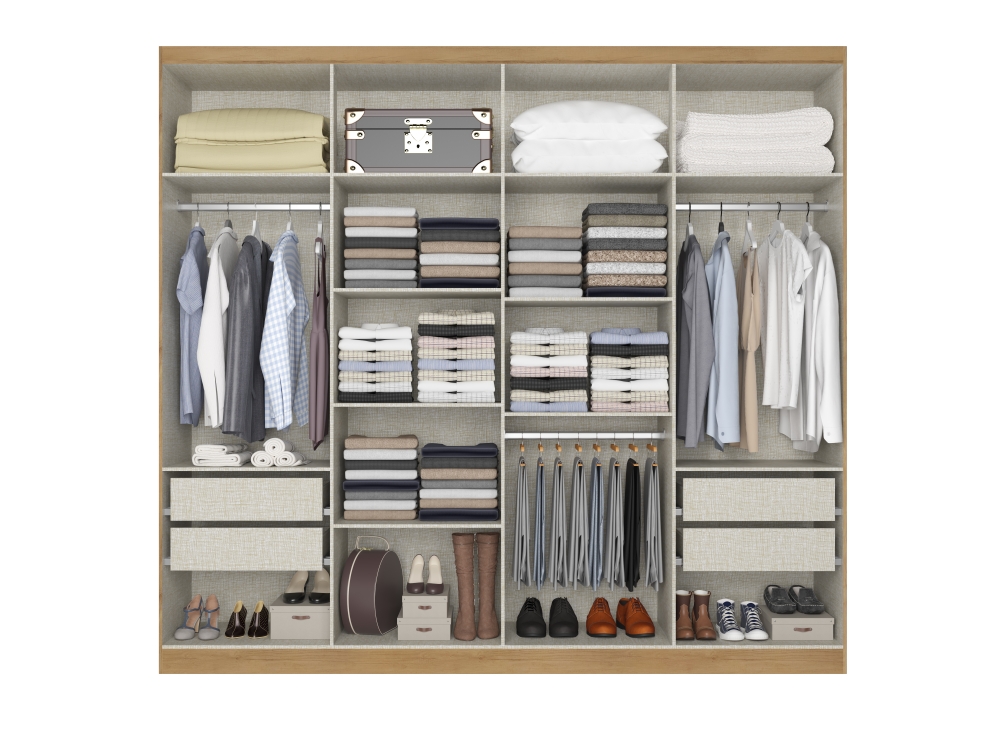 Seu interno possui uma excelente divisão para casal... com cabideiros, gavetas e prateleiras separadas. Ainda possui espaço para colocar sapatos e um amplo maleiro interligado, proporcionando espaço completo para acomodar os seus pertences de maneira organizada.