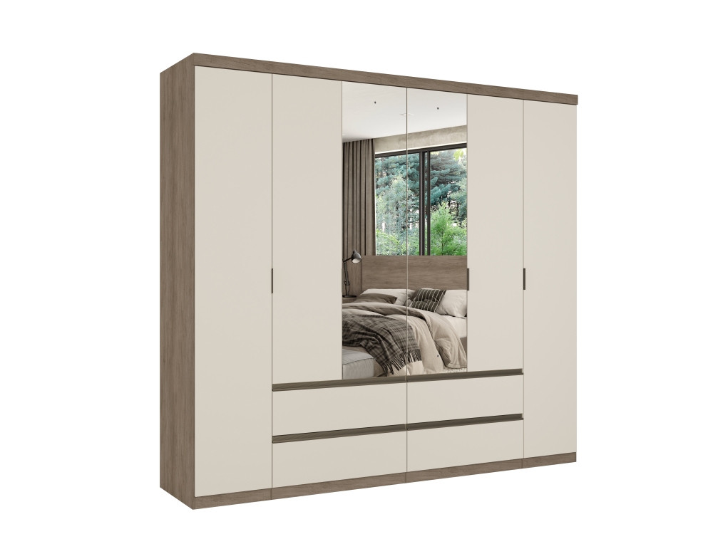 É constituído de 6 portas e 4 gavetas externas com trilho telescópico que conferem conforto e praticidade ao móvel. Seu amplo espaço interno possui cabideiros, maleiros grandes e muitas prateleiras, uma excelente divisão ele/ela.