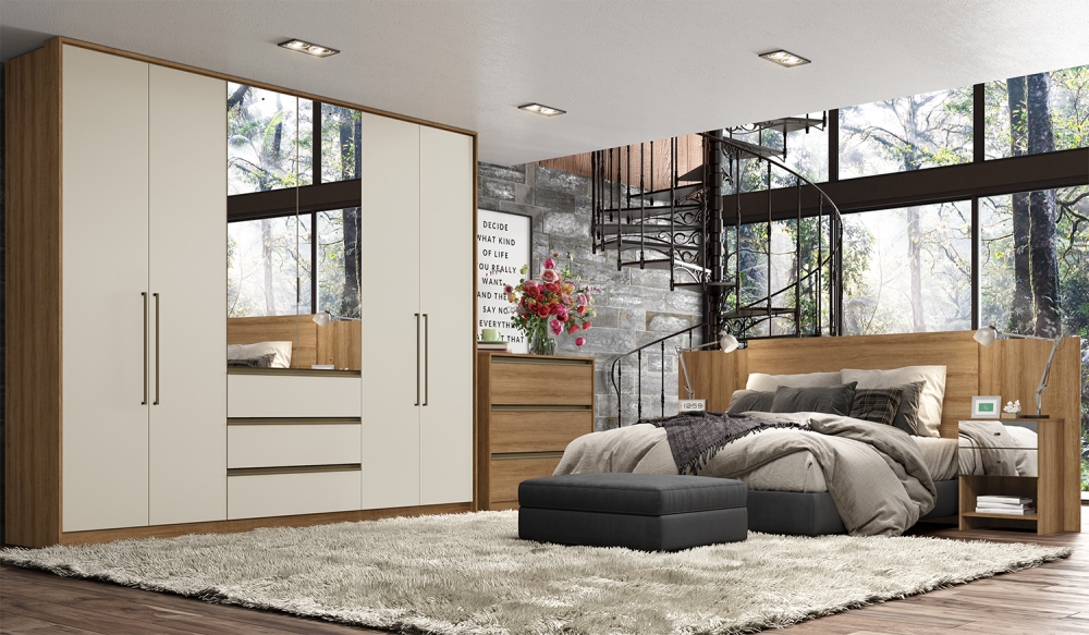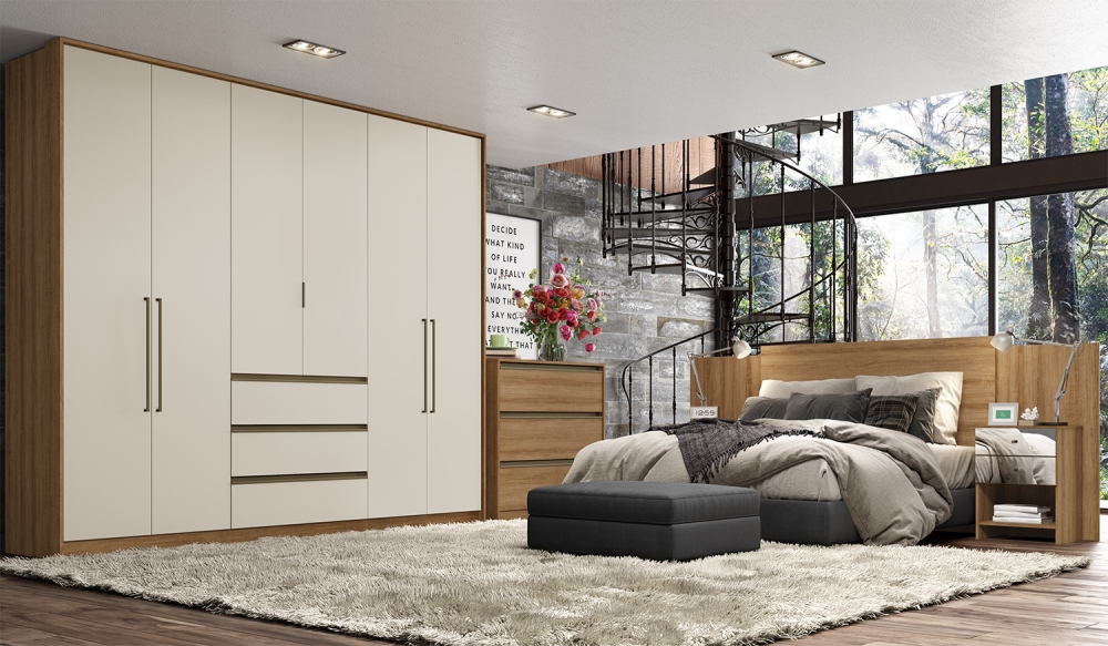 É constituído de 6 portas e 3 gavetas externas com trilho telescópico, que conferem conforto e praticidade ao móvel. Seu amplo espaço interno possui cabideiro inclusive para roupas longas, maleiros grandes e muitas prateleiras. Sua moldura envoltória proporciona sensação de leveza e plenitude ao produto, enquanto lindos puxadores em bronze (alumínio nas portas e perfil ABS nas gavetas) dão um toque de elegância e espelhos inteiros nas portas centrais proporcionam amplitude e requinte ao ambiente, na versão Glass.