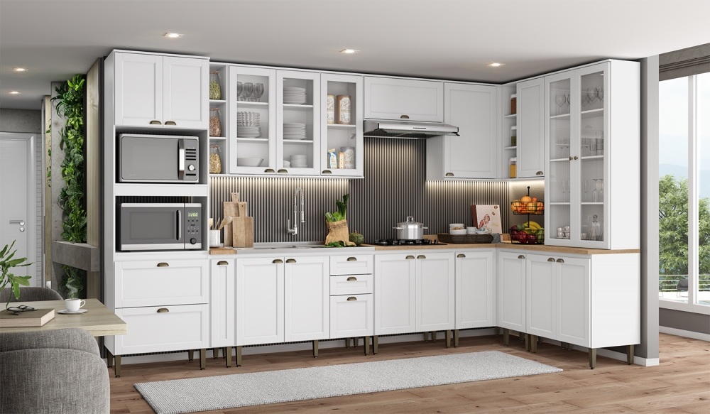 Inspirada no estilo provençal, a Cozinha Classy é produzida 100% em MDF de alta qualidade, permitindo que você monte ambientes funcionais sem perder a praticidade e elegância de uma cozinha planejada. A cozinha Classy possui portas e frentes de gavetas com molduras, opção de vidros nos módulos aéreo 120cm e Cristaleira, corrediças telescópicas, puxadores concha na cor bronze, pés reguláveis, dobradiças 35mm com sistema de amortecimento, aéreos com confortáveis 90cm de altura, torre e cristaleira com 2,40m de altura, entre outros diferenciais que só a cozinha Classy tem. O padrão branco acetinado com tampos amadeirados remetem a cozinha diretamente ao clássico estilo provençal, com conceito minimalista, oferecendo muita classe e sofisticação ao ambiente. O lançamento possui muitos diferenciais exclusivos da THB que vão encantar nessa cozinha feita especialmente para você!