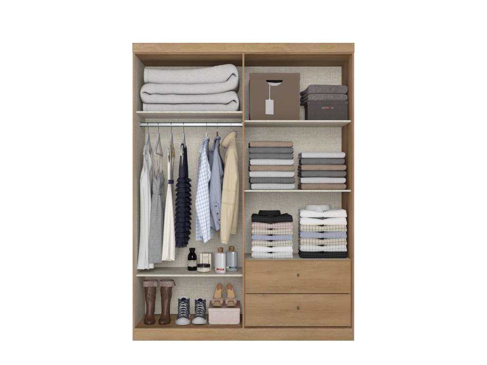 O Roupeio Star está afinado com as mais modernas tendências nos dormitórios lançados na Europa, onde praticidade, inovação e elegância são seus diferenciais. Possui ainda 2 gavetas grandes externas com corrediças metálicas, e um interno muito atrativo com cabideiro, prateleiras e o mais importante: com dimensões que possam ser colocadas em pequenos espaços.